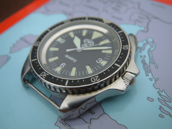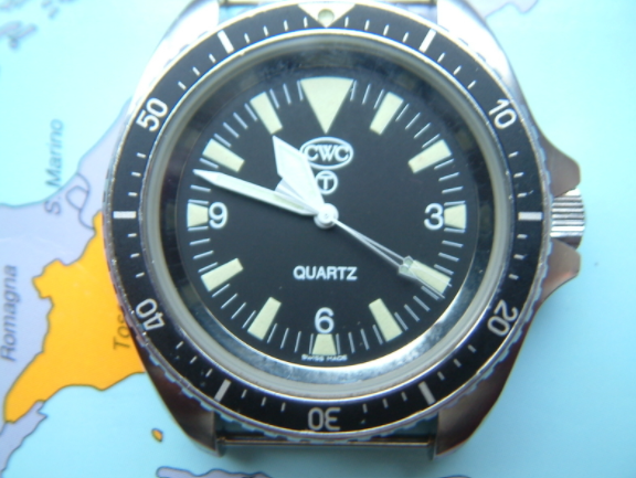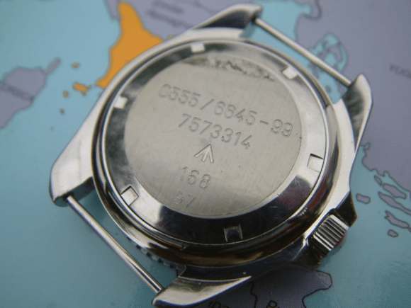 This is a genuine watch that was actually issued during it's life to a member of the armed services (probably a Royal Marine Specialist Diver). It bears the stores reference 0555/6645-99 7573314 and the issue number 168/97 indicating that it was the 168th such watch issued in 1997.