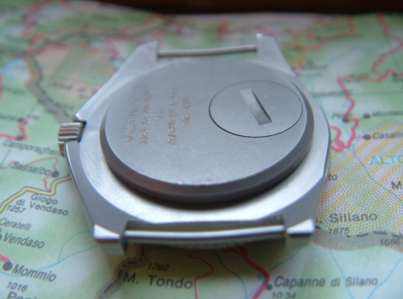 Case Diameter: 42 mm, Case Height: 11.25 mm, Case length: 47.5mm, Lug Width: 19.5 mm, Movement: Quartz, multi-jeweled unknown mfr. Case material: Stainless steel, Crown: Screw down, Bezel: Bi-directional, Water resistance: 6 atm (198 ft), Vintage: June 1990