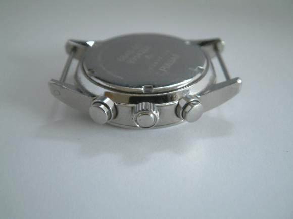 The pusher at 2 'O' Clock starts and stops the chronograph functions working while the pusher at 4 'O' Clock resets the chronograph functions to zero.
