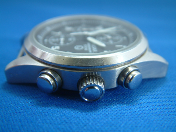 The pusher at 2 'O' Clock starts and stops the chronograph functions working while the pusher at 4 'O' Clock resets the chronograph functions to zero.