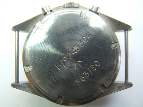 These large chronographs were issued specifically to the RAF. This example bears the stores reference number 6BB/9243306 and the unique issue number for this watch which is 363/80 indicating that it was the 363rd such watch issued in the RAF in 1980.
