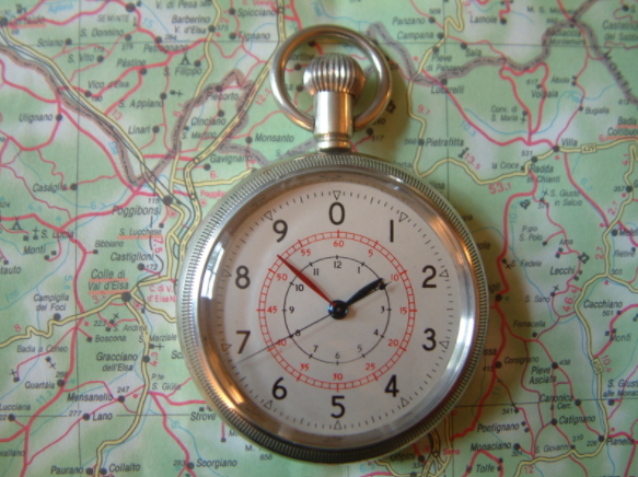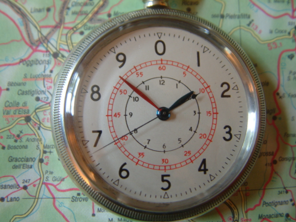 'These watches were supplied to the Royal Navy in 1942 and are fitted with a high quality 15 jewel movement and centre seconds hand. After the war the deck watches went into storage at the Chronometer section of the Hydrographic Department at Hermonceaux Castle; there during the 1950's they had their enamel dials replaced with special decimal dials using smaller hour and minute hands. the dial layout gives emphasis to minutes, which are picked out in red on the intermediate chapter ring and an outer ring has been calibrated to indicate 100 units per minute. These watches were particularly useful for rapid mathematical calculations.'