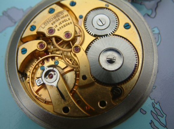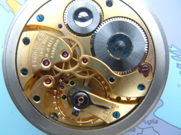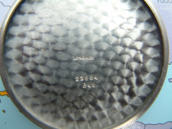 The watch has the Longines plated 19.70N 16 jewel movement which is in good clean condition but has not been serviced during my ownership. The watch is however keeping very good time as is to be expected for a deck watch of this calibre. The movement is numbered 6702380 and the last 4 digits of this number are also engraved on the edge knurled screw back case. There is a slight rectangular marking to the rear case around the outside of the numbering which has probably been caused by the glue from a sticker over the numbers at some stage during it's life.