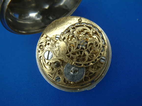 The square hinged case is in lovely condition the only real testament to it's 244 years of age being wear to the case release button which has worn through where it has been pressed over the centuries. This button could be easily replaced although I personally prefer to leave as is it being original to the watch. The movement is in excellent running condition the top pivot has been replaced at some stage during it's life.