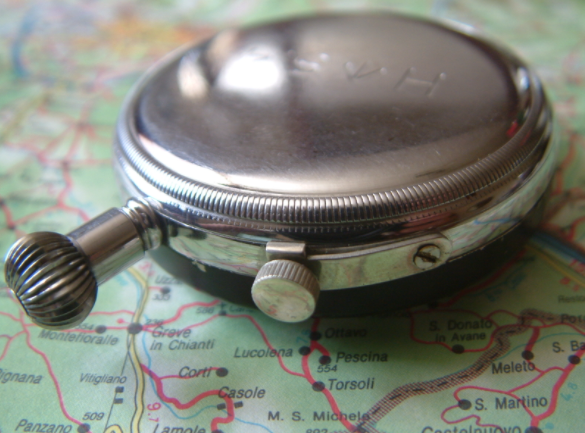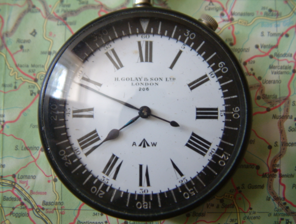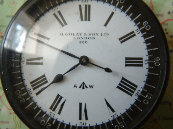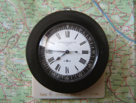 These watches were used during WW2 in the Fleet Air Arm Fairey Swordfish aircraft. The watch was mounted on the aircraft dashboard using the bakelite holder shown. The watch was used for navigation purposes and the aircraft position could be calculated using the radio signal from 'Beacon North'.