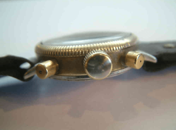 The case is nickel plated over brass with a screwed caseback and a ribbed moveable bezel. The case and bezel plating has wear in places consistent with the 70+ years age of the watch but has a very pleasing patina with no excessive polishing or damage. Both pusher caps and the crown have loss of plating with the brass showing through. The bezel turns freely and smoothly.