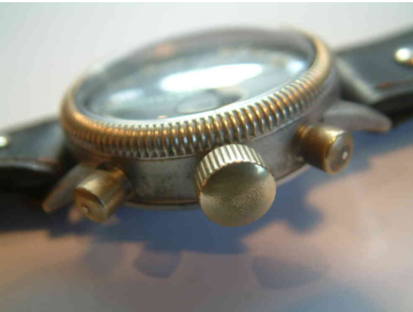 The case is nickel plated over brass with a screwed caseback and a ribbed moveable bezel. The case and bezel plating has wear in places consistent with the 70+ years age of the watch but has a very pleasing patina with no excessive polishing or damage. Both pusher caps and the crown have loss of plating with the brass showing through. The bezel turns freely and smoothly.